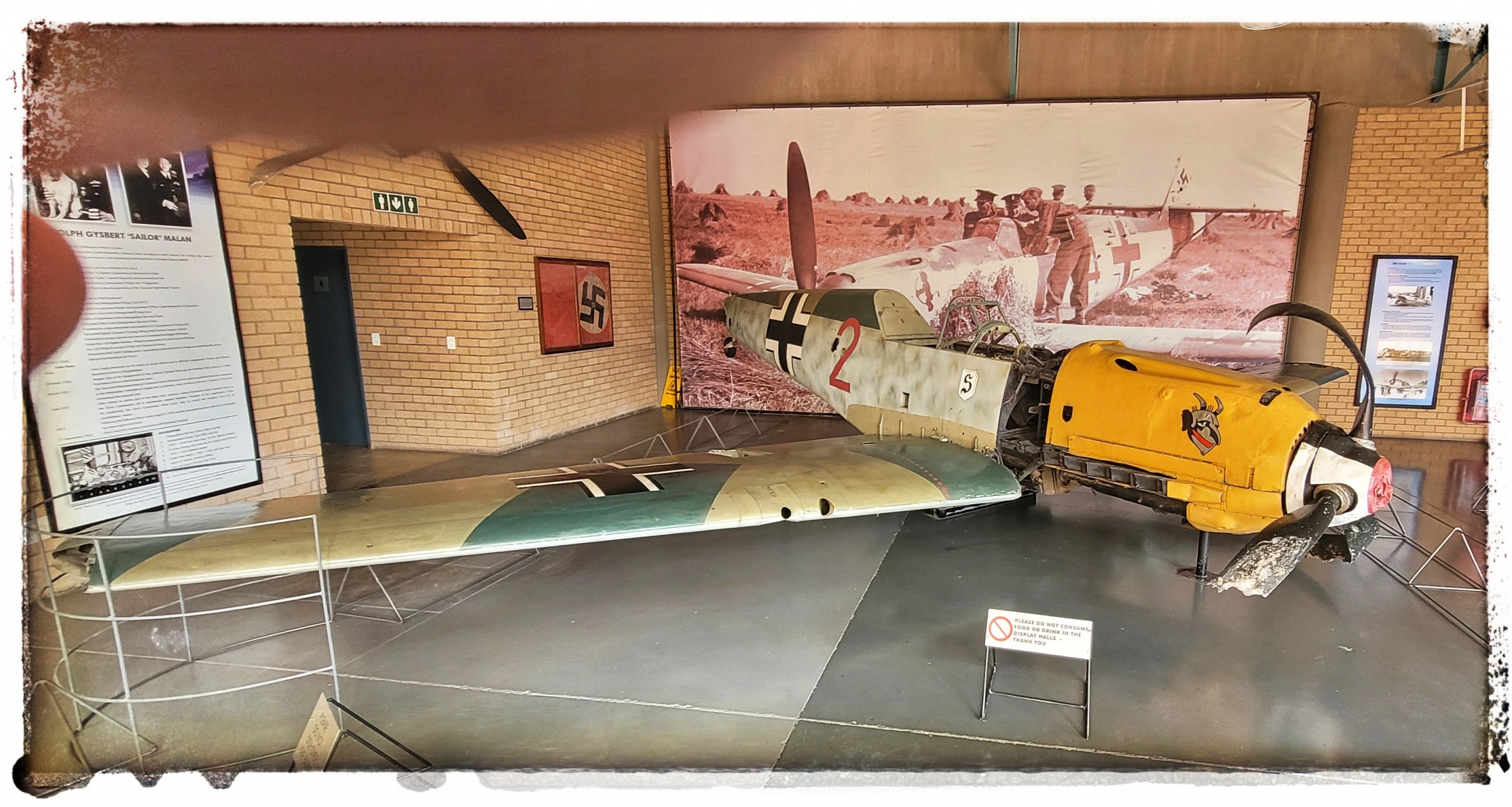 Me109 that ran out of fuel over Essex, it was brought to SA as part of a traveling museum and ended up staying in the Museum, they also have a tidy version in the forbidden hall.